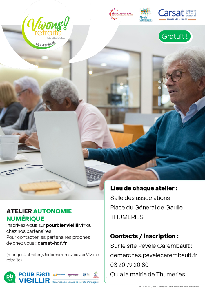 Cet accompagnement gratuit se compose de 9 séances thématiques, entre le 28 avril et le 23 juin, à la salle des associations de Thumeries. Inscrivez-vous en remplissant le formulaire sur demarches.pevelecarembault.fr (rubrique seniors), ou par téléphone au 03 20 79 20 80 (standard de Pévèle Carembault) ou en contactant la mairie de Thumeries au 03 20 16 85 95.
