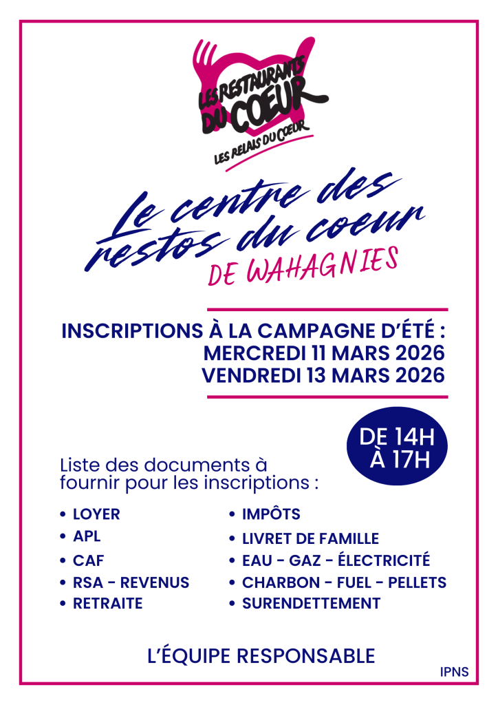 Pensez à vous munir des documents nécessaires à l’inscription et présentez-vous aux locaux de restos du cœur de Wahagnies les 11 et 13 mars 2026, entre 14h et 17h.