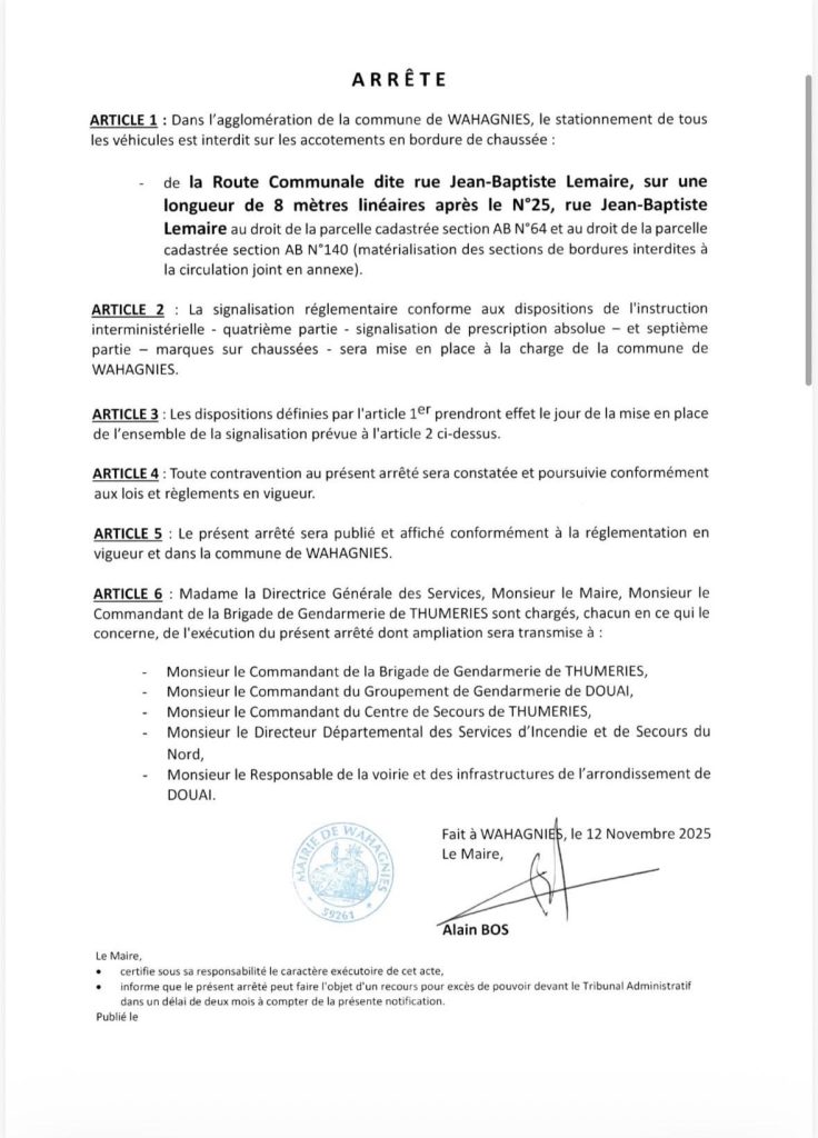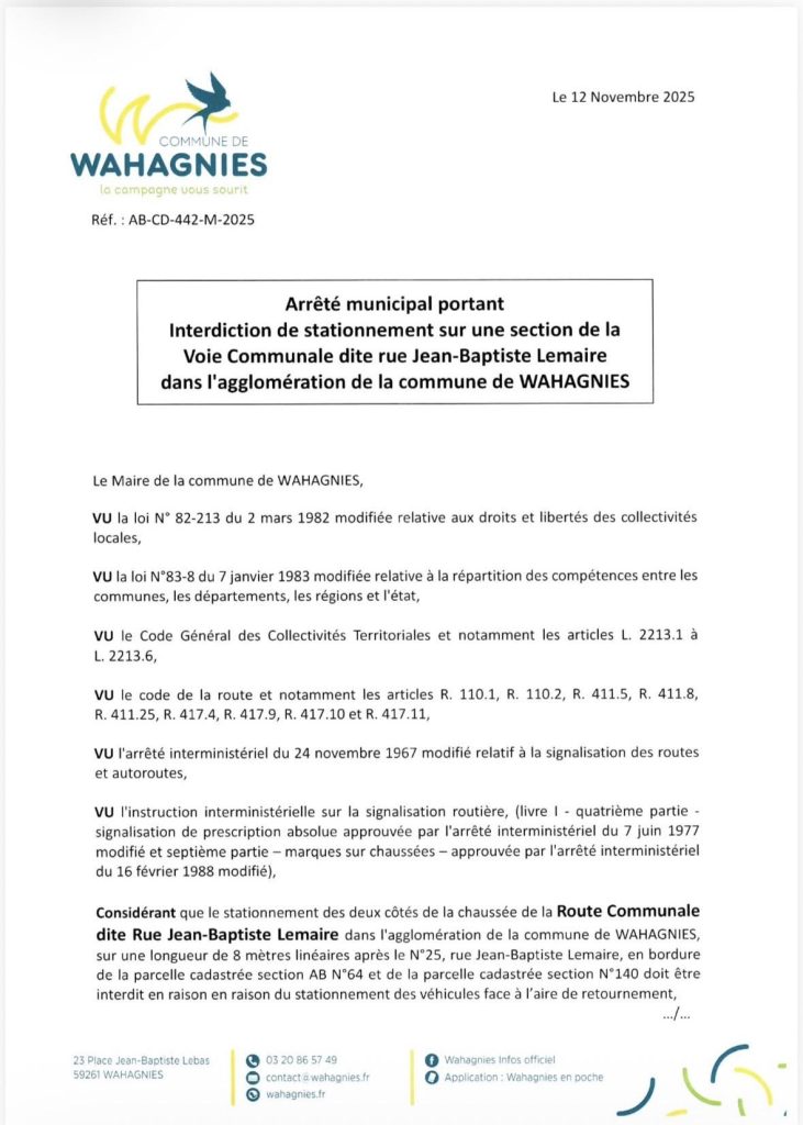 La Commune de Wahagnies informe les habitants qu’un arrêté municipal en date du 12 novembre 2025 instaure une interdiction de stationnement sur une section de la Rue Jean-Baptiste LEMAIRE.